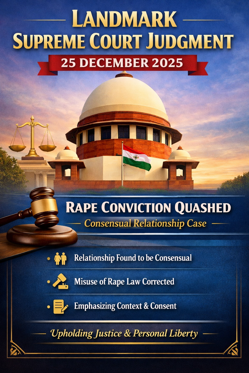 On 25 December 2025, the Supreme Court of India delivered a significant judgment reinforcing the principles of criminal justice, consent, and misuse of penal law. The Court set aside a rape conviction, holding that the relationship between the parties was consensual in nature and had been wrongly criminalised by the lower courts.